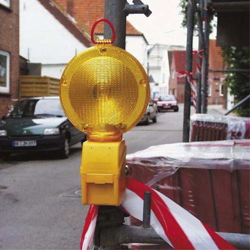 Geel knipperende werflichten ter afbakening van de bouwwerf. Gaan automatisch knipperen bij het donker worden.